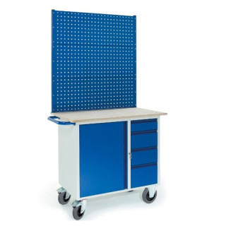 Werkstattwagen in Stahlblechkonstruktion, Schränke mit 1 festen und 2 variablen Böden, Schubladen mit Gleitführung und Zentralverschluss mittels Zylinderschloss, Belastung 25 kg je Schublade